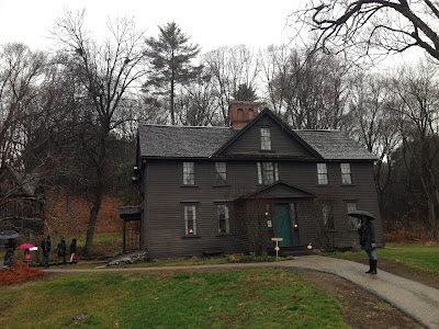 El primer tren sortia a les 8.30, però hem agafat el següent, a les 11.15. Hi ha uns 45 minuts des de Boston, mitja hora des de Somerville (a la tornada sí que hem baixat a Porter Sq. i he aprofitat per passar pel supermercat -també hi he comprat Clam Chowder de Legal Seafoods, ara que fa fresqueta). La nostra excursió d'avui davall de la pluja ha consistit en una passejada pel poble (realment, m'hauria agradat molt venir-hi al començament de la tardor, però els colors de les fulles encara feien goig i avui era el dia en què els americans van a buscar l'arbre de Nadal, després d'Acció de Gràcies i del Black Friday, i el decoren. Concord és el poble més nadalenc que he vist mai. Estava tot ple de corones, arbres amb llumetes -més cotxes passaven amb els arbres a remolc-, il·luminacions diverses, botigues de decoració nadalenca...), ple de mansions de fusta. Els pobles d'aquí no tenen res a veure amb un poblet europeu. Moltes vegades em costa saber si es tracta d'una urbanització solta amb cases escampades al voltant d'una carretera. Tenen un carrer principal (o carretera) i botigues (a vegades em recorden els outlets i tot) a cada banda (no hi falten Starbuck i Donkin Donuts) i després les mansions de fusta amb jardí, bastant escampades, enmig de la natura. Solen ser pareguts. Tenen unes quantes esglésies (això també em sorprèn) amb cementeris, una biblioteca pública que fa goig, potser museus/parc històric o natural i es desplacen en cotxe. De carrers n'hi ha molt pocs. De carreteres, més. Avui no hi havia gent passejant, però en canvi els dos museus que hem visitat estaven pleníssims i l'Orchard House és molt estreta, de manera que es fa difícil moure't per les habitacions (les visites amb guia), però m'ha encantat i el preu era raonable (no com el del Museu de Concord). Ara bé, no han explotat gaire el merxandatge de l'escriptora, si ho comparo amb la casa de Jane Austen, per exemple o el moviment que hi ha rere el museu de Joyce.